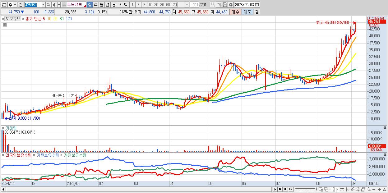 - 토모큐브 (44,850원 ▲ 6.15% , 시총: 5,945억, 거래량: 368,428, 거래대금:158억, KOSDAQ)