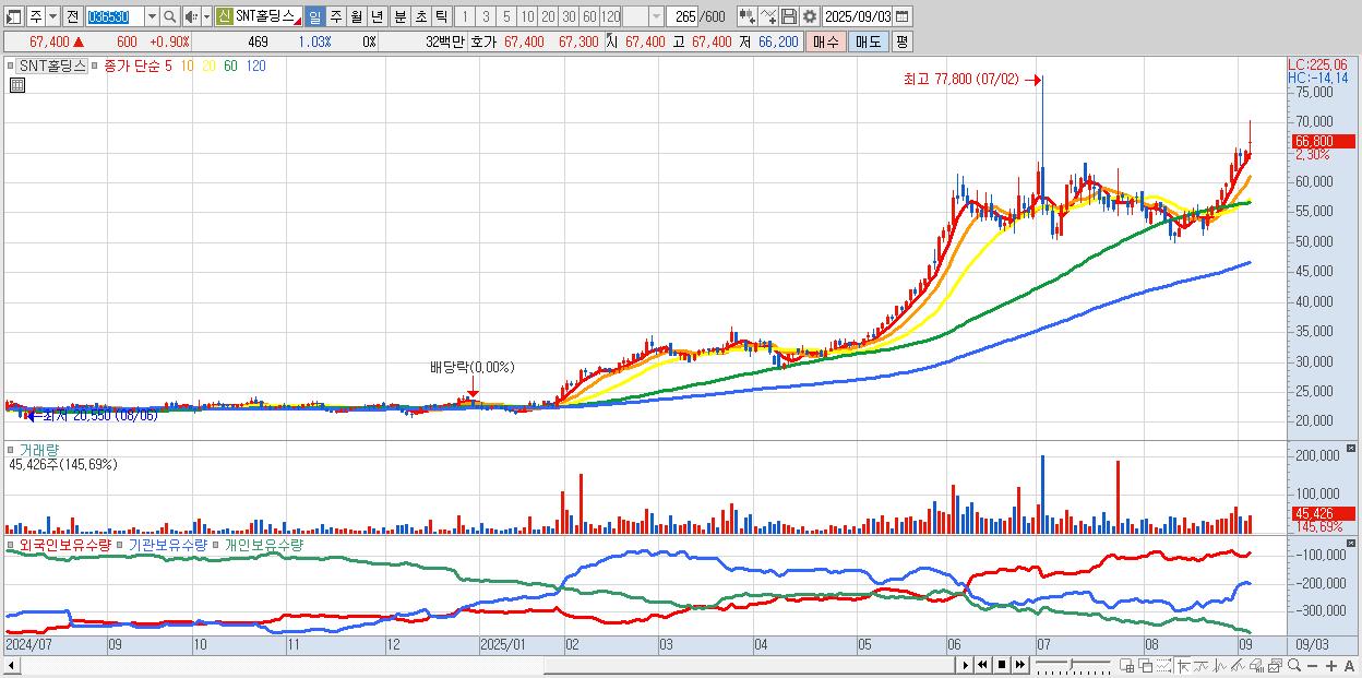 - SNT홀딩스 (66,800원 ▲ 3.09% , 시총: 10,891억, 거래량: 34,942, 거래대금:23억, KOSPI)