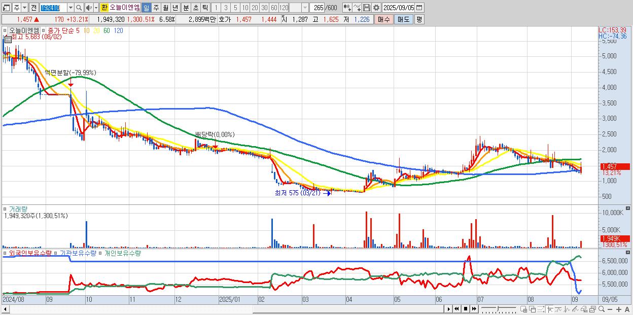 - 오늘이엔엠 (1,457원 ▲ 13.21% , 시총: 431억, 거래량: 1,949,320, 거래대금:29억)