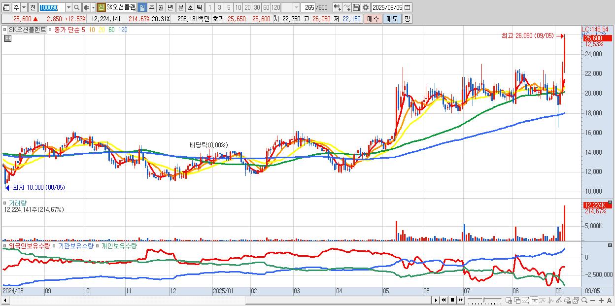 - SK오션플랜트 (25,600원 ▲ 12.53% , 시총: 15,406억, 거래량: 12,224,141, 거래대금:2,982억)