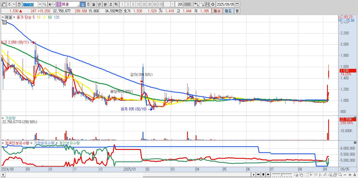 - 베셀 (1,530원 ▲ 19.25% , 시총: 301억, 거래량: 22,758,677, 거래대금:346억)