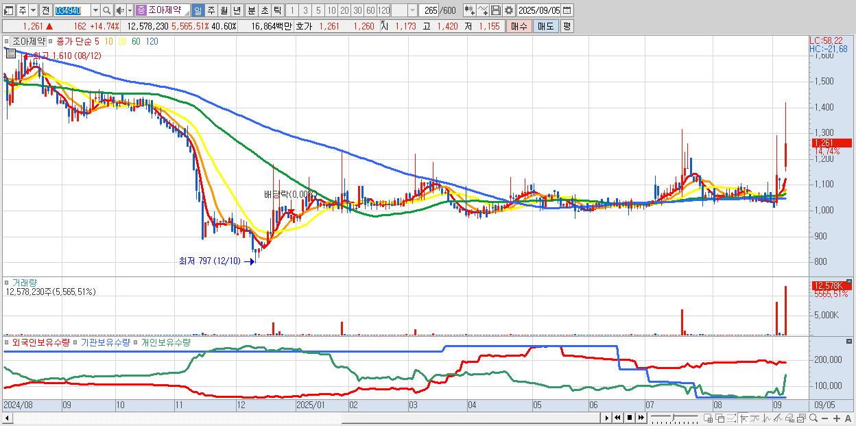 - 조아제약 (1,261원 ▲ 14.74% , 시총: 391억, 거래량: 12,578,230, 거래대금:169억)