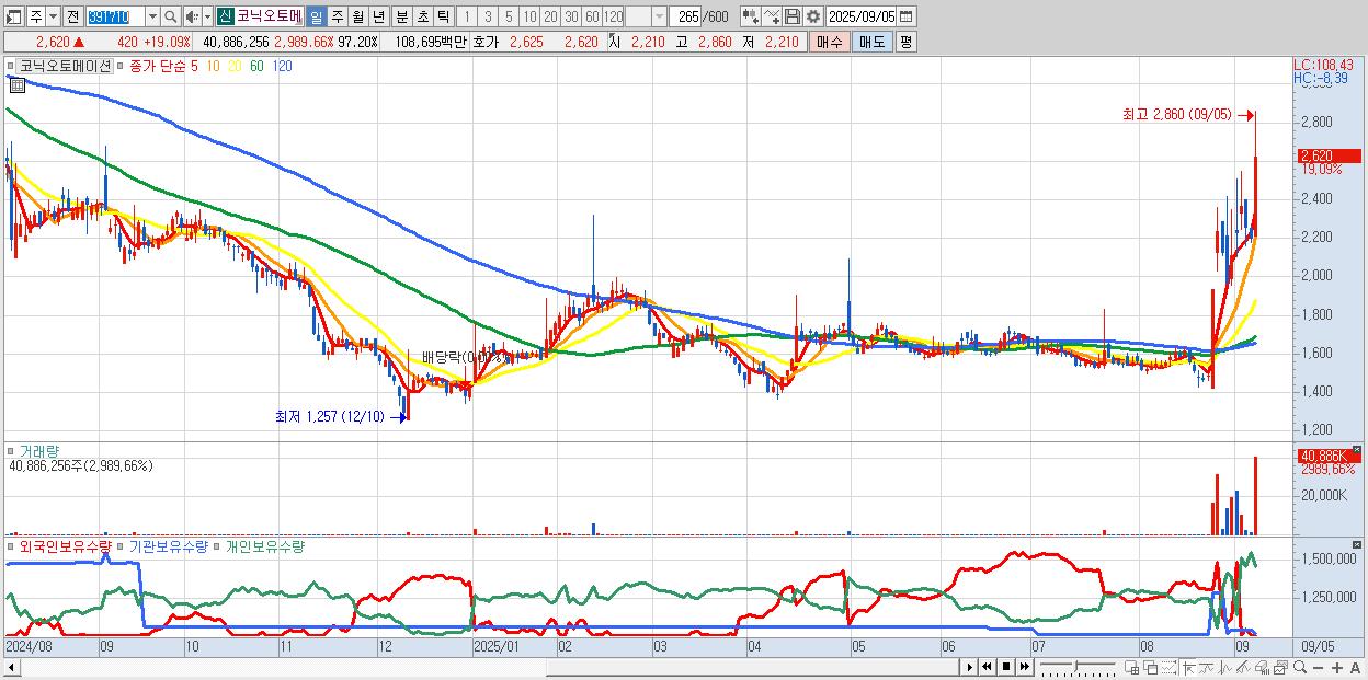 - 코닉오토메이션 (2,620원 ▲ 19.09% , 시총: 1,102억, 거래량: 40,886,256, 거래대금:1,087억)