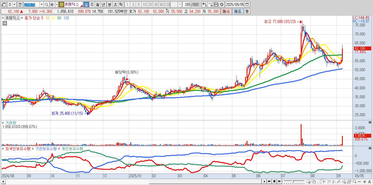 - 휴메딕스 (62,400원 ▲ 14.92% , 시총: 7,007억, 거래량: 957,142, 거래대금:586억)