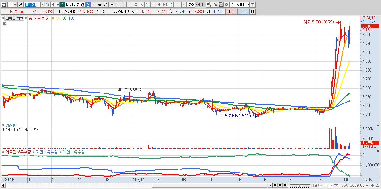 - 티에이치엔 (5,240원 ▲ 9.17% , 시총: 943억, 거래량: 1,425,306, 거래대금:74억)