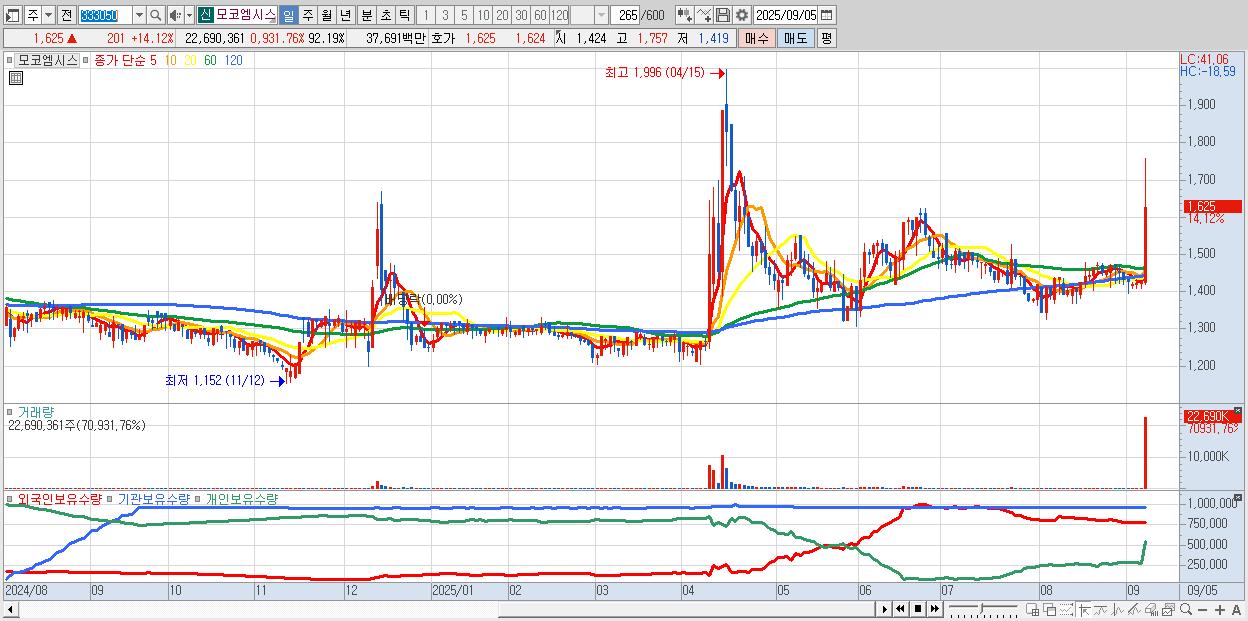 - 모코엠시스 (1,625원 ▲ 14.12% , 시총: 400억, 거래량: 22,690,361, 거래대금:377억)