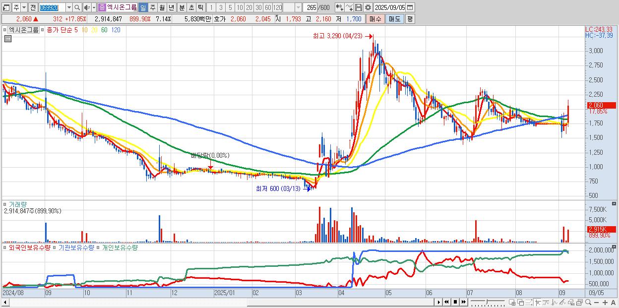 - 엑시온그룹 (2,060원 ▲ 17.85% , 시총: 841억, 거래량: 2,914,847, 거래대금:58억)