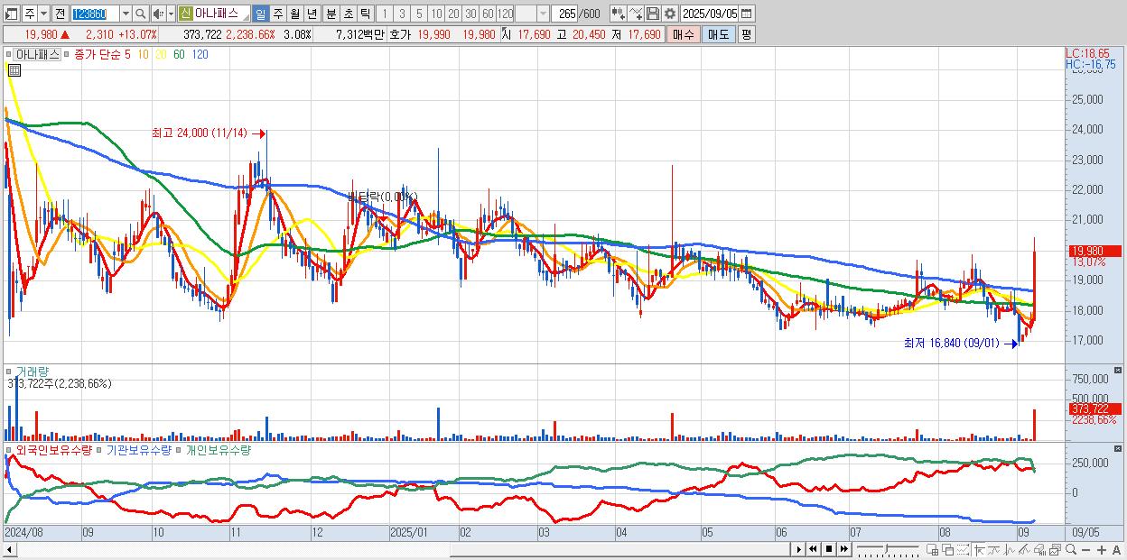 - 아나패스 (19,980원 ▲ 13.07% , 시총: 2,422억, 거래량: 373,722, 거래대금:73억)