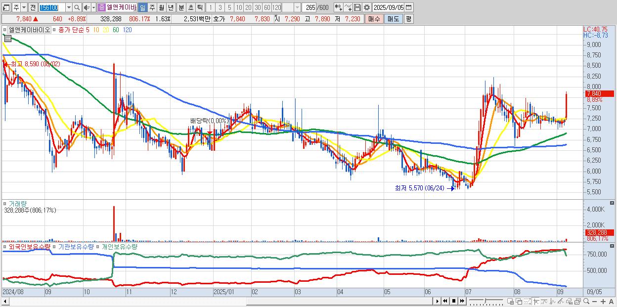 - 엘앤케이바이오 (7,840원 ▲ 8.89% , 시총: 1,582억, 거래량: 328,288, 거래대금:25억)