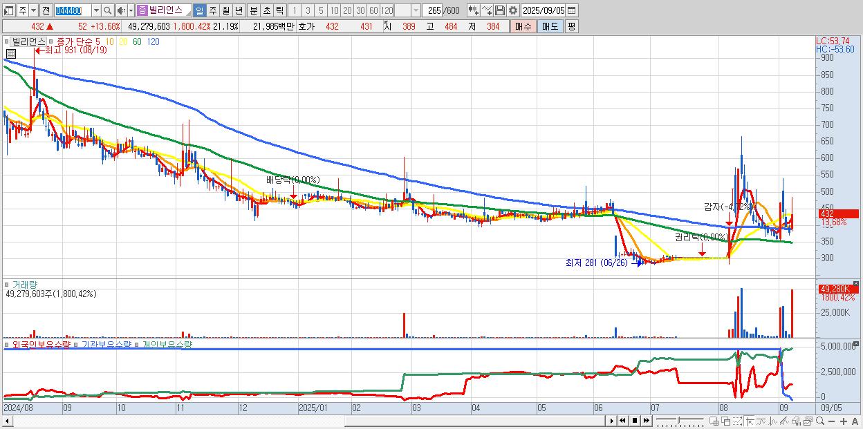 - 빌리언스 (432원 ▲ 13.68% , 시총: 176억, 거래량: 49,279,603, 거래대금:220억)