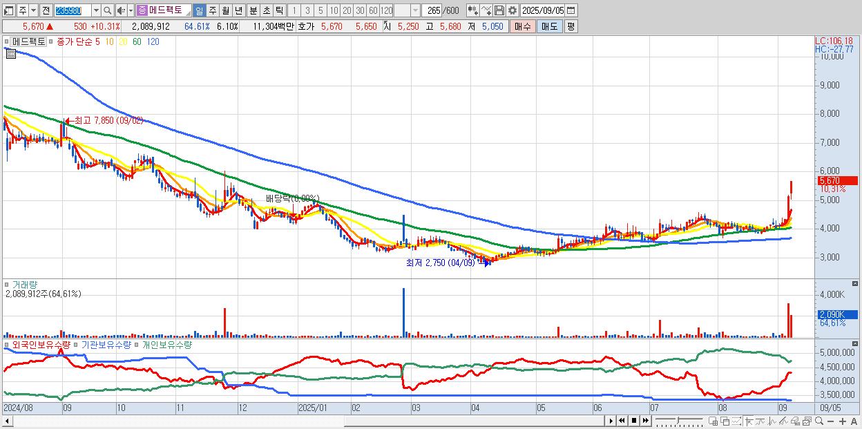 - 메드팩토 (5,670원 ▲ 10.31% , 시총: 1,943억, 거래량: 2,089,912, 거래대금:113억)
