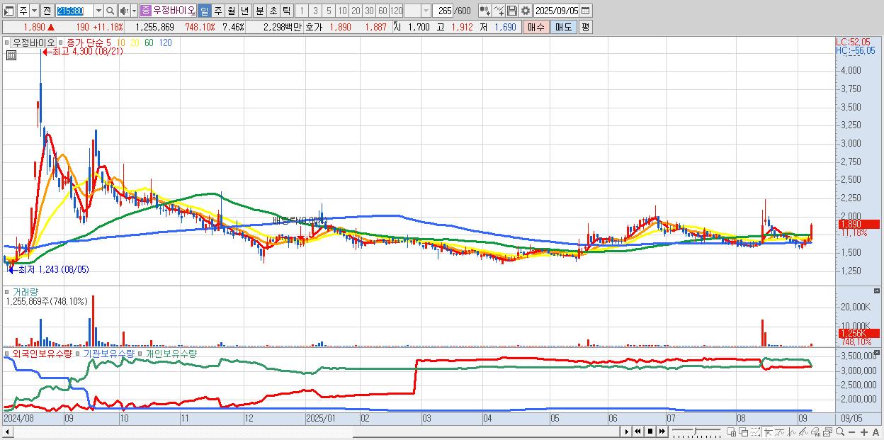 - 우정바이오 (1,890원 ▲ 11.18% , 시총: 318억, 거래량: 1,255,869, 거래대금:23억)