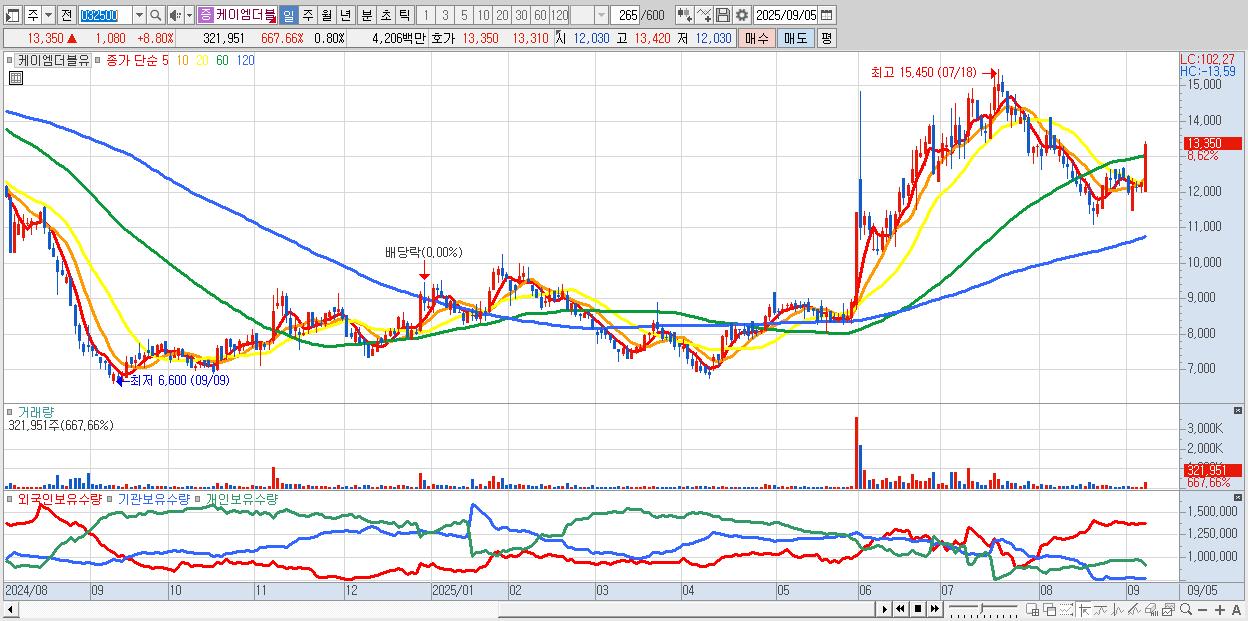 - 케이엠더블유 (13,340원 ▲ 8.72% , 시총: 5,375억, 거래량: 185,214, 거래대금:24억)