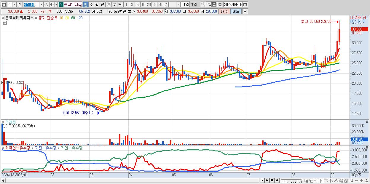 - 온코닉테라퓨틱스 (33,350원 ▲ 9.17% , 시총: 3,690억, 거래량: 3,817,396, 거래대금:1,265억)