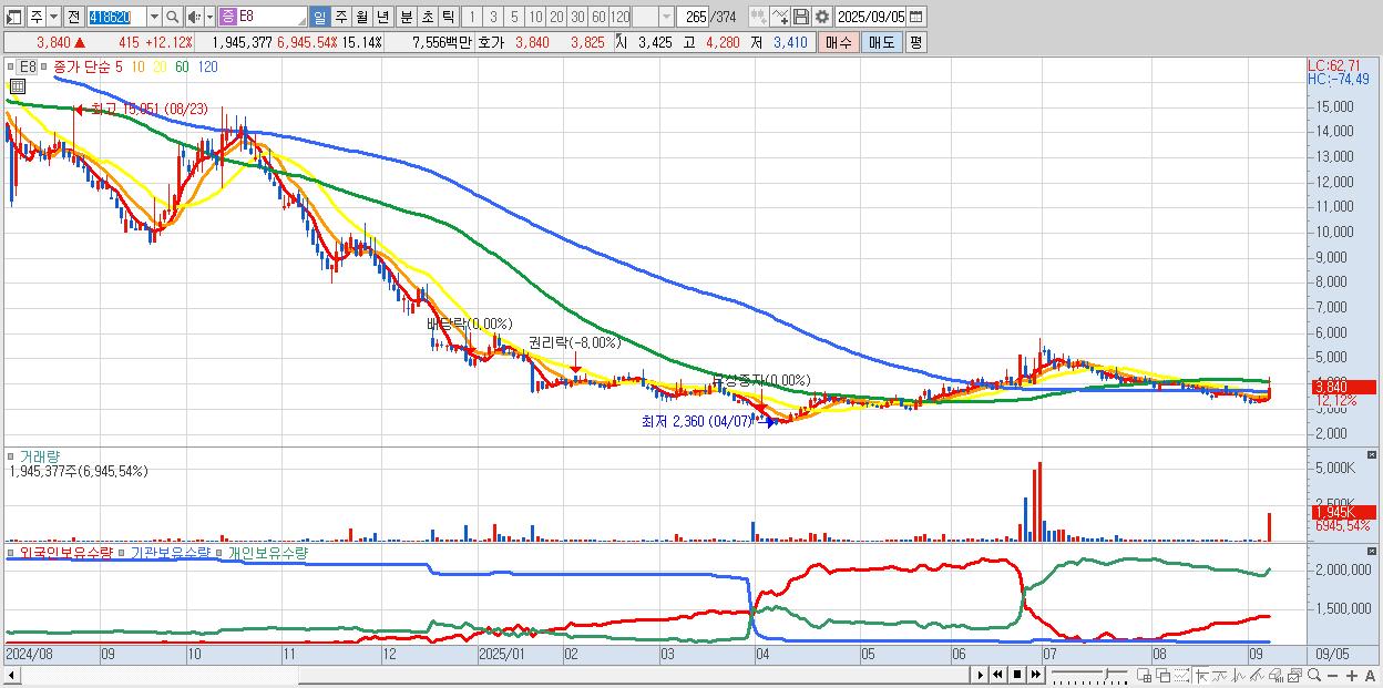 - E8 (3,840원 ▲ 12.12% , 시총: 493억, 거래량: 1,945,377, 거래대금:76억)