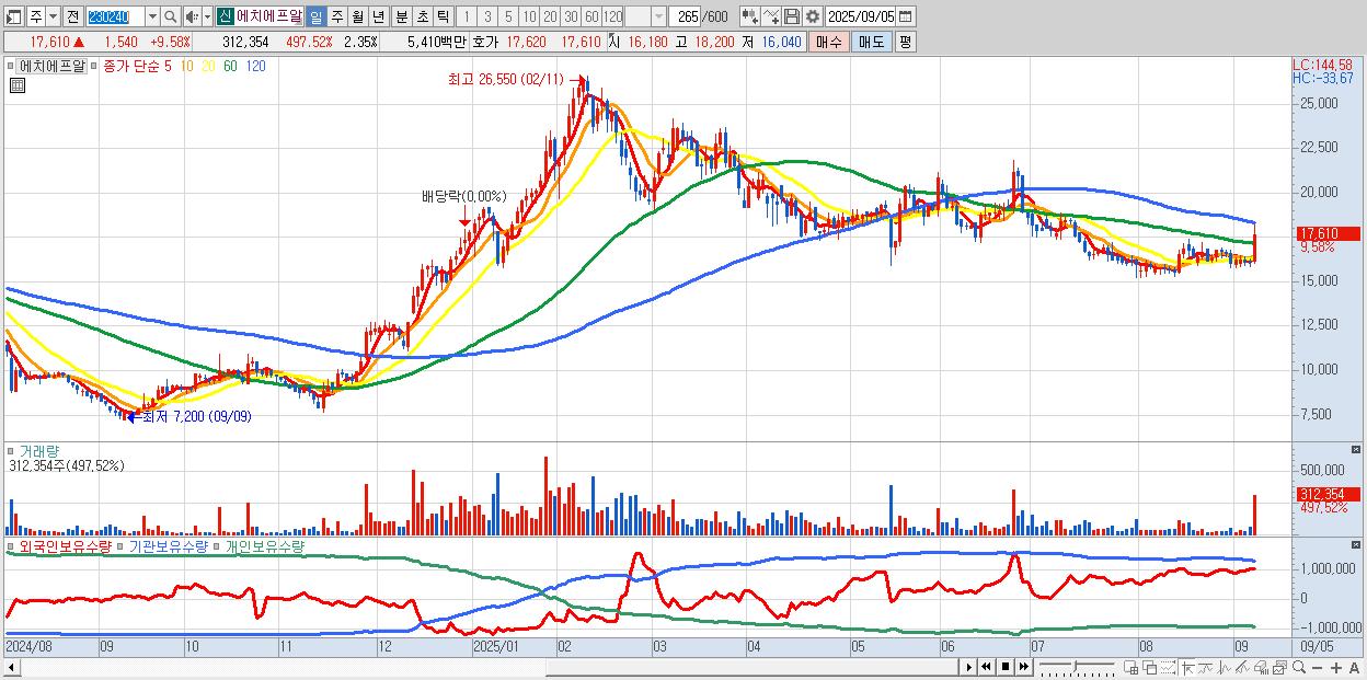 - 에치에프알 (17,610원 ▲ 9.58% , 시총: 2,344억, 거래량: 312,354, 거래대금:54억)