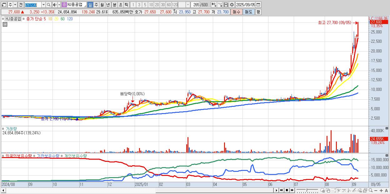 - HJ중공업 (27,600원 ▲ 13.35% , 시총: 22,984억, 거래량: 24,654,894, 거래대금:6,359억)