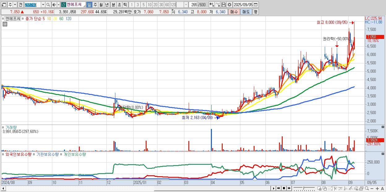 - 엔에프씨 (7,050원 ▲ 10.16% , 시총: 630억, 거래량: 3,991,858, 거래대금:293억)