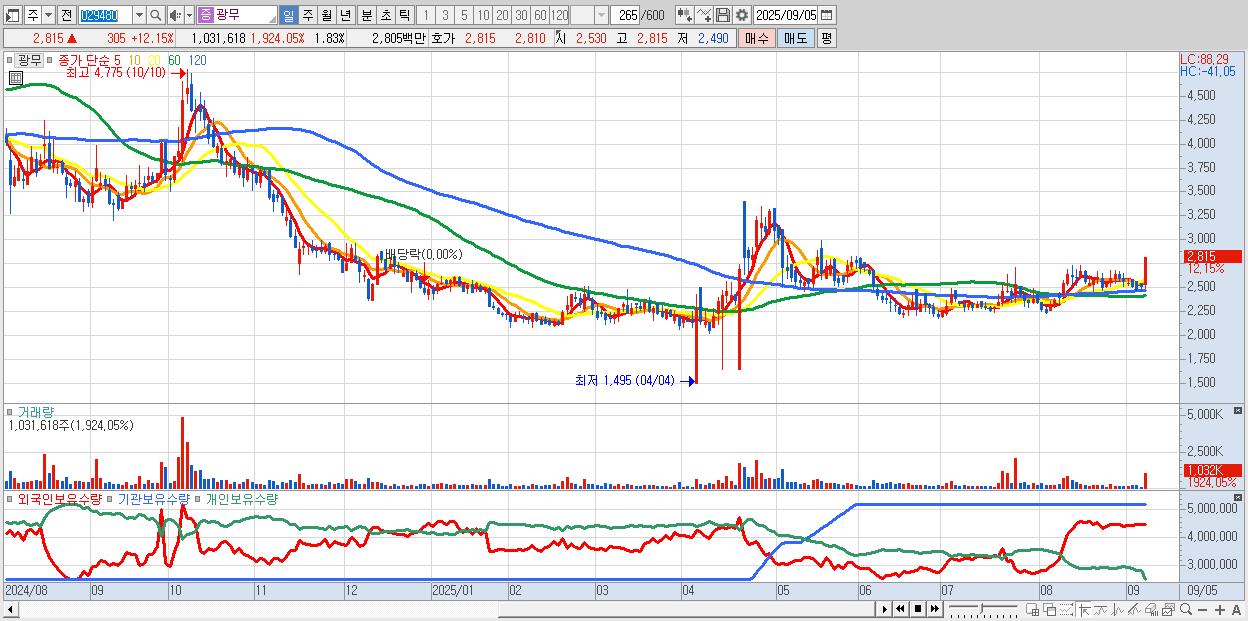 - 광무 (2,815원 ▲ 12.15% , 시총: 1,585억, 거래량: 1,031,618, 거래대금:28억)
