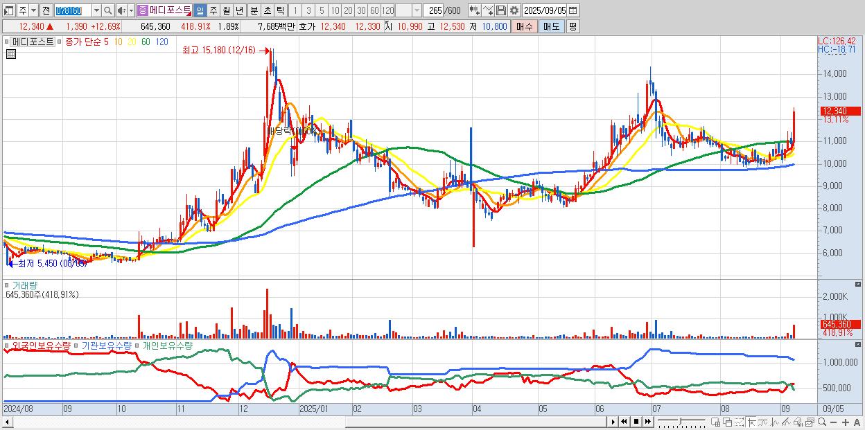 - 메디포스트 (12,330원 ▲ 12.6% , 시총: 4,219억, 거래량: 402,346, 거래대금:48억)