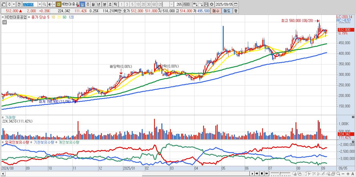 - HD현대중공업 (513,000원 ▲ 0.59% , 시총: 455,406억, 외국인 순매수 거래금:255억)