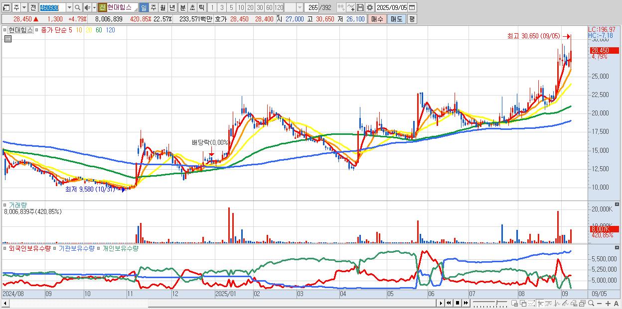 - 현대힘스 (28,450원 ▲ 4.79% , 시총: 10,094억, 외국인 순매수 거래금:50억)