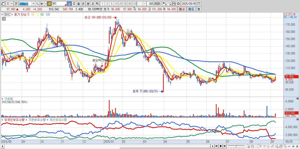 - SKC (97,700원 ▲ 4.05% , 시총: 36,997억, 외국인 순매수 거래금:107억)