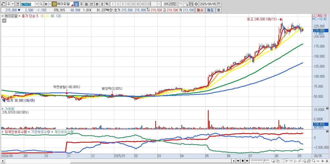 - 에이피알 (215,500원 ▼ -0.92% , 시총: 80,663억, 외국인 순매수 거래금:53억)