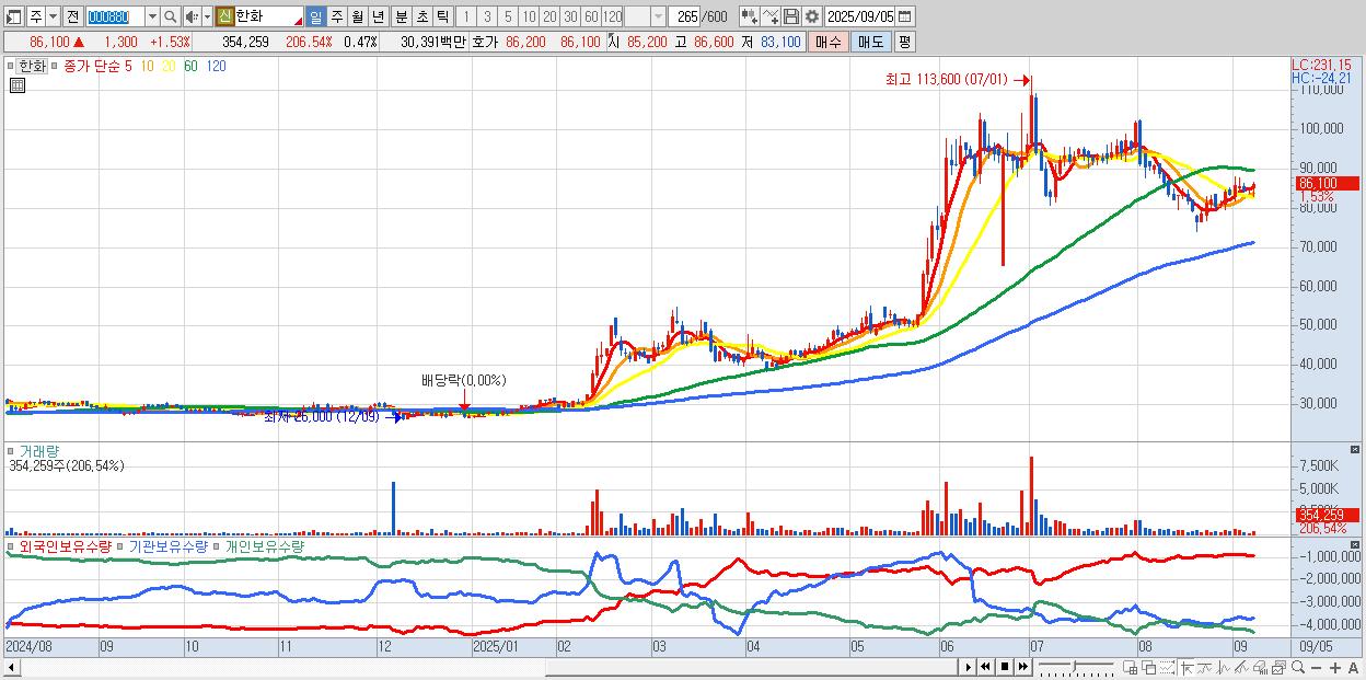 - 한화 (86,100원 ▲ 1.53% , 시총: 64,539억, 외국인 순매수 거래금:59억)