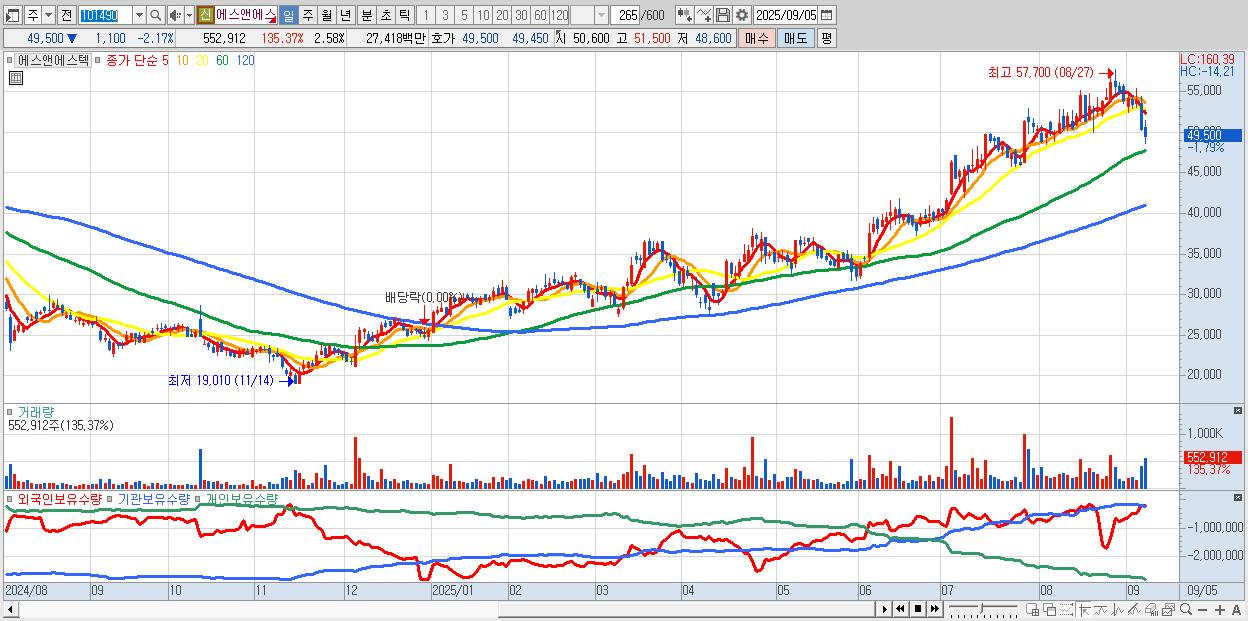 - 에스앤에스텍 (49,300원 ▼ -2.57% , 시총: 10,576억, 외국인 순매수 거래금:55억)