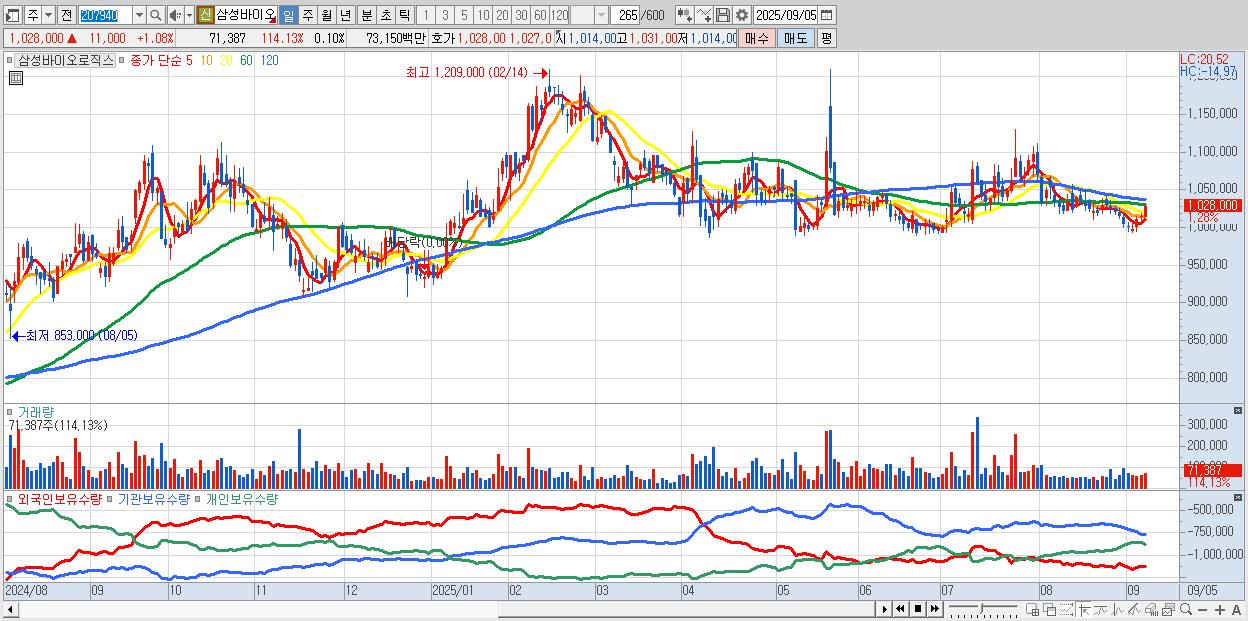 - 삼성바이오로직스 (1,030,000원 ▲ 1.28% , 시총: 733,092억, 외국인 순매수 거래금:209억)
