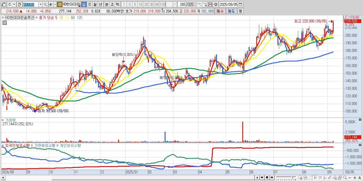 - HD현대마린솔루션 (220,000원 ▲ 7.58% , 시총: 98,624억, 외국인 순매수 거래금:83억)