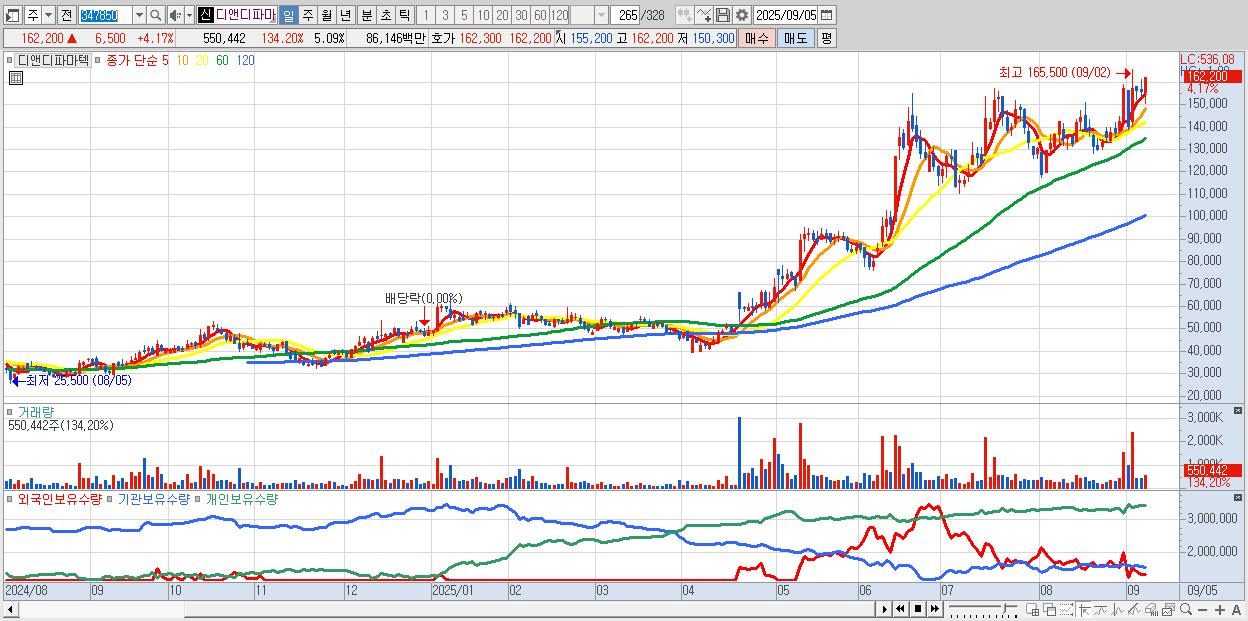 - 디앤디파마텍 (162,200원 ▲ 4.17% , 시총: 17,551억, 외국인 순매수 거래금:52억)