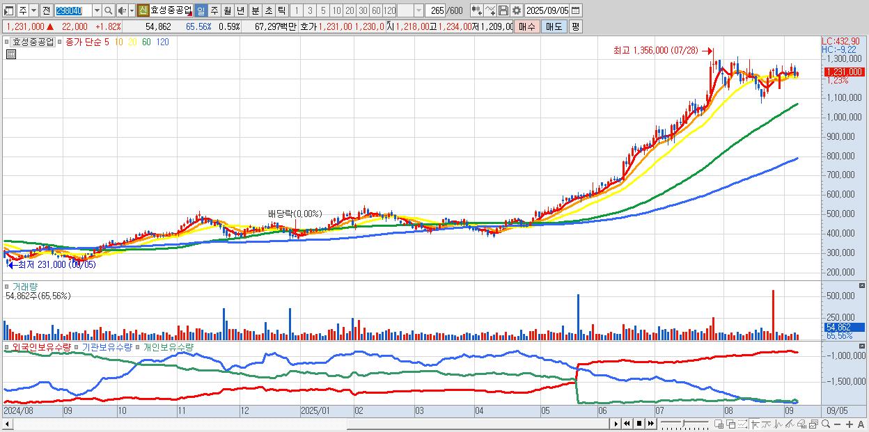 - 효성중공업 (1,232,000원 ▲ 1.9% , 시총: 114,878억, 외국인 순매수 거래금:139억)