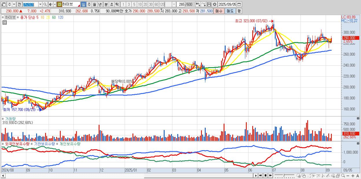 - 하이브 (290,500원 ▲ 2.65% , 시총: 120,999억, 외국인 순매수 거래금:69억)