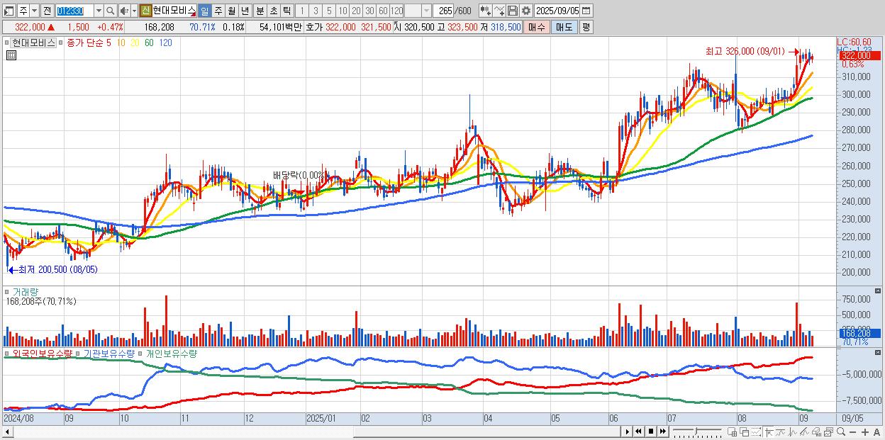 - 현대모비스 (323,000원 ▲ 0.78% , 시총: 296,498억, 외국인 순매수 거래금:117억)