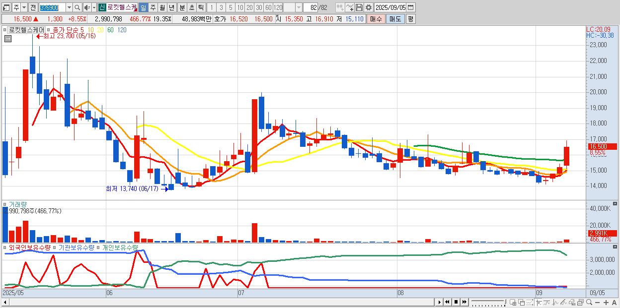 - 로킷헬스케어 (16,570원 ▲ 9.01% , 시총: 2,562억, 외국인 순매수 거래금:59억)