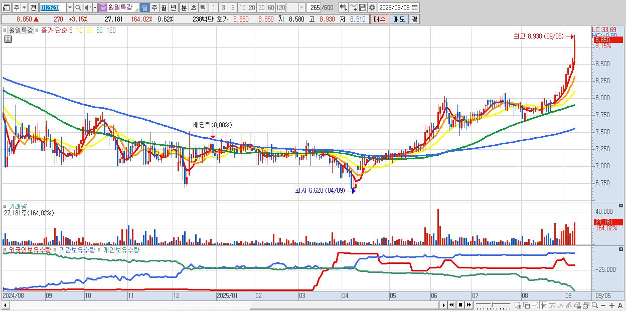 - 원일특강 (8,850원 ▲ 3.15% , 시총: 389억, 거래량: 27,181, 거래대금:2억, KOSDAQ)
