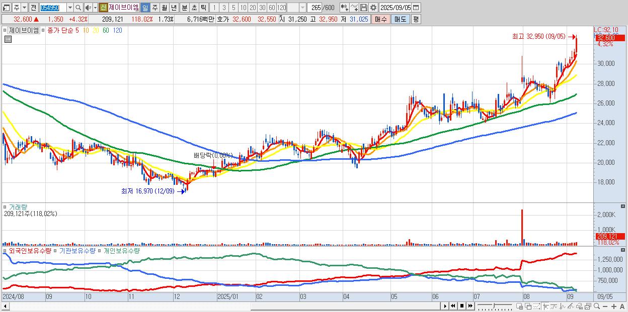 - 제이브이엠 (32,600원 ▲ 4.32% , 시총: 3,941억, 거래량: 209,121, 거래대금:67억, KOSDAQ)