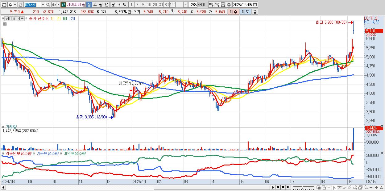 - 케이피에프 (5,710원 ▲ 3.82% , 시총: 1,181억, 거래량: 1,442,315, 거래대금:84억, KOSDAQ)