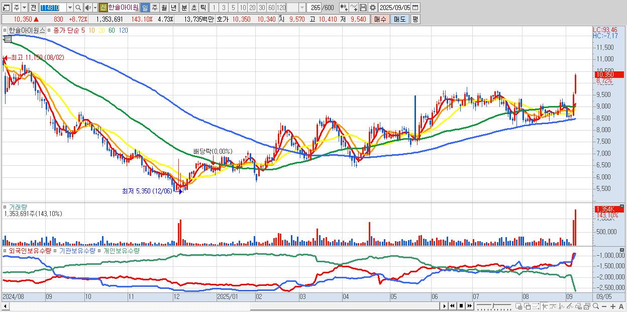 - 한솔아이원스 (10,350원 ▲ 8.72% , 시총: 2,959억, 거래량: 1,353,691, 거래대금:137억, KOSDAQ)