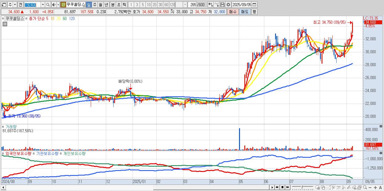 - 쿠쿠홀딩스 (34,600원 ▲ 4.85% , 시총: 12,305억, 거래량: 81,697, 거래대금:28억, KOSPI)