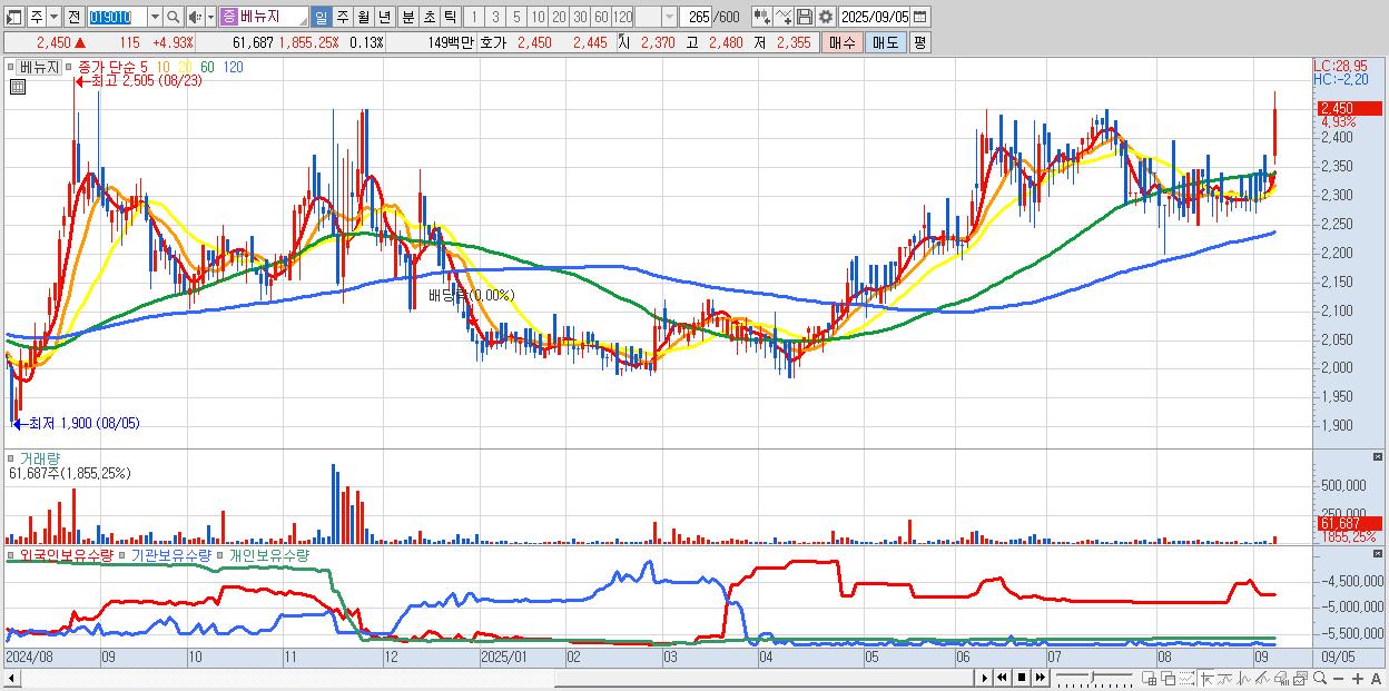- 베뉴지 (2,450원 ▲ 4.93% , 시총: 1,181억, 거래량: 61,687, 거래대금:1억, KOSDAQ)