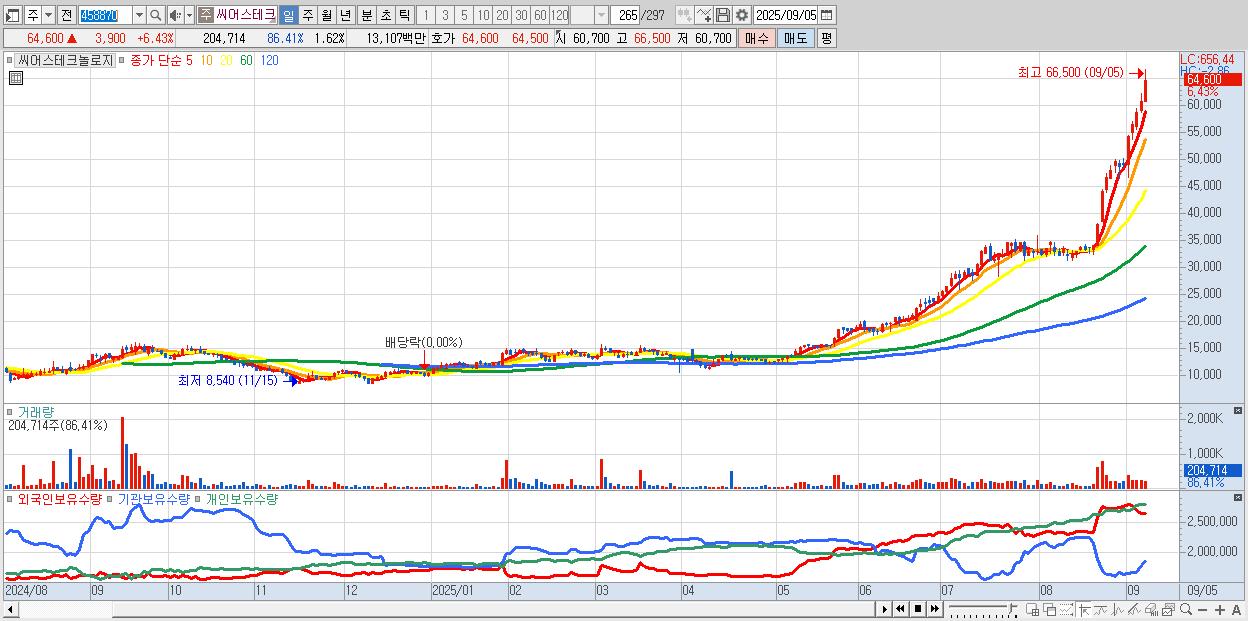 - 씨어스테크놀로지 (64,600원 ▲ 6.43% , 시총: 8,182억, 거래량: 204,714, 거래대금:131억, KOSDAQ)