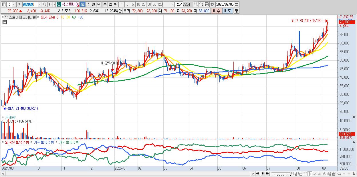 - 넥스트바이오메디컬 (72,400원 ▲ 3.58% , 시총: 5,884억, 거래량: 137,023, 거래대금:98억, KOSDAQ)