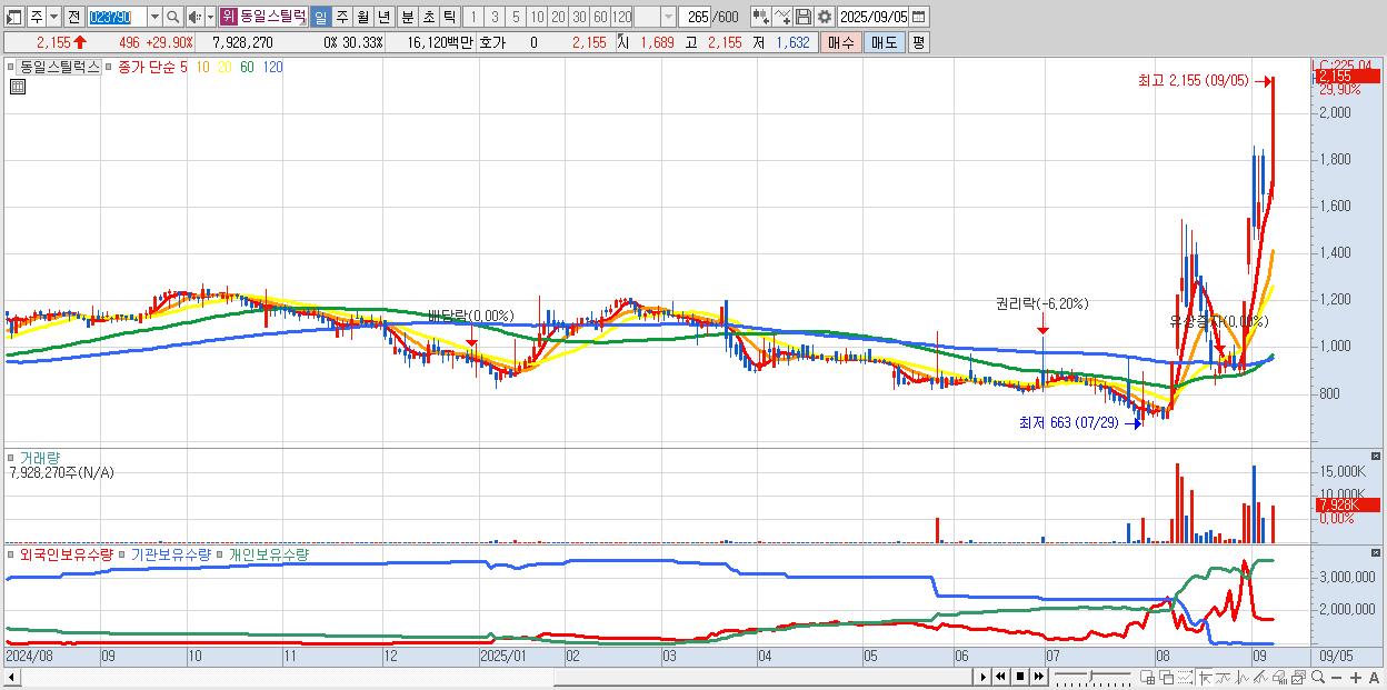 - 동일스틸럭스 (2,155원 ▲ 29.9% , 시총: 563억, 거래량: 7,928,270, 거래대금:161억, KOSDAQ)