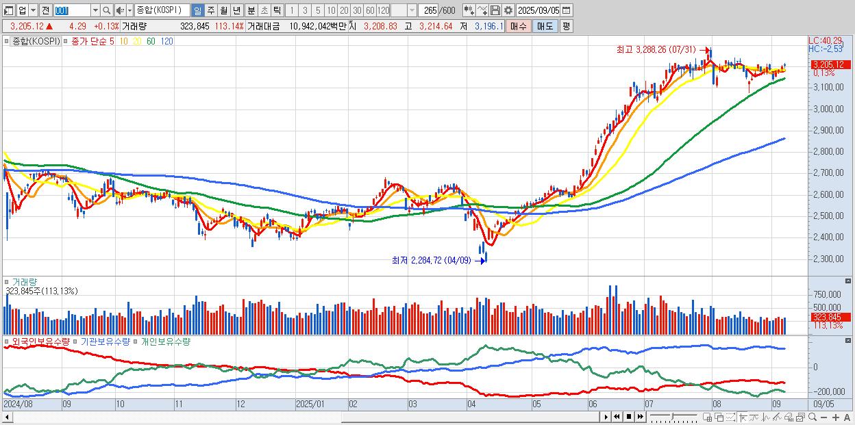 | 09/05 | 3,205.12 | ▲0.13% | -552억 | -1,374억 | 1,124억 | 802억 |