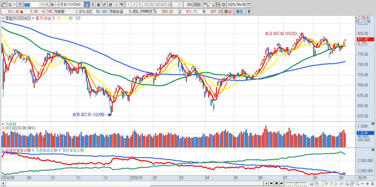 | 09/05 | 811.40 | ▲0.74% | -699억 | 451억 | 331억 | -83억 |