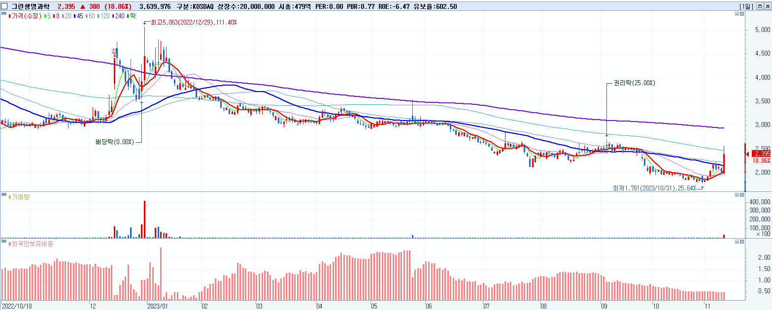- 그린생명과학 (2,395원 ▲ 18.86% , 시총: 479억, 거래량: 3,642,564, 거래대금:88억)