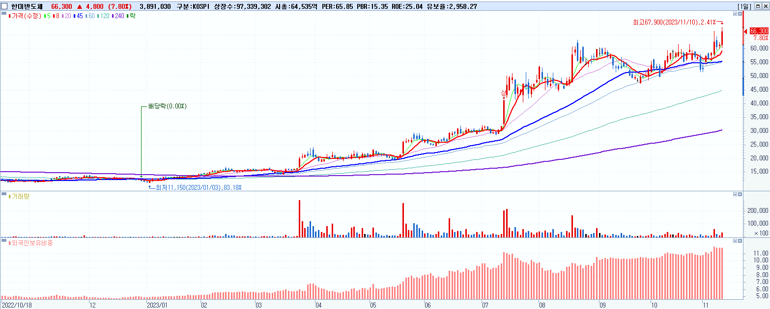 - 한미반도체 (66,300원 ▲ 7.8% , 시총: 64,536억, 거래량: 3,893,559, 거래대금:2,531억)